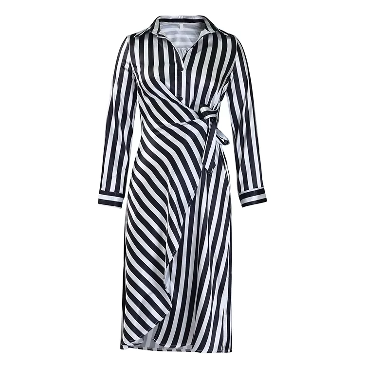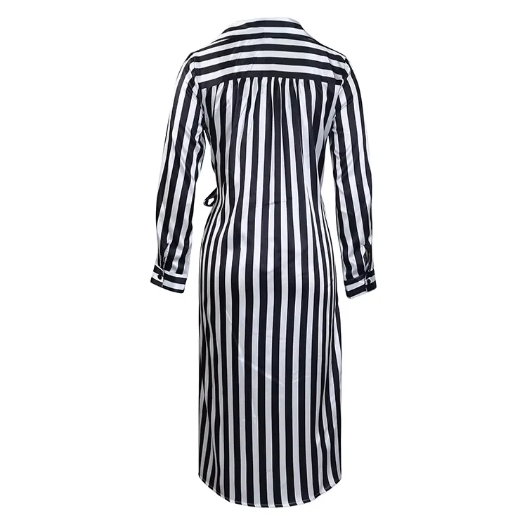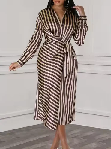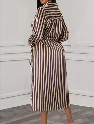 Fitted Stripe Long Sleeve Women's Blouse Dress Eco-Friendly Woven African Style Sashes Natural Maxi Breathable Washable Slits